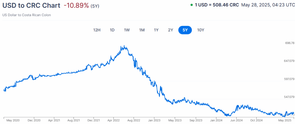 Between 2021 and 2025, the value of the U.S. dollar has decreased by nearly 18% when exchanged into Costa Rican colones.